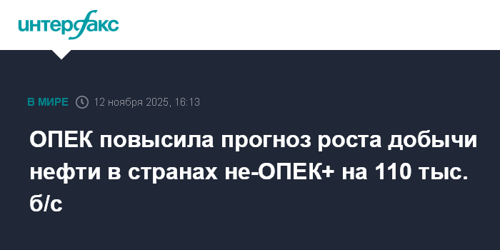Москва. 12 ноября. INTERFAX.RU - ОПЕК повысила прогноз роста предложения жидких углеводородов (ЖУВ) из стран не-ОПЕК+ на 2025 год до 920 тыс. б/с, говорится в ежемесячном отчете организации.