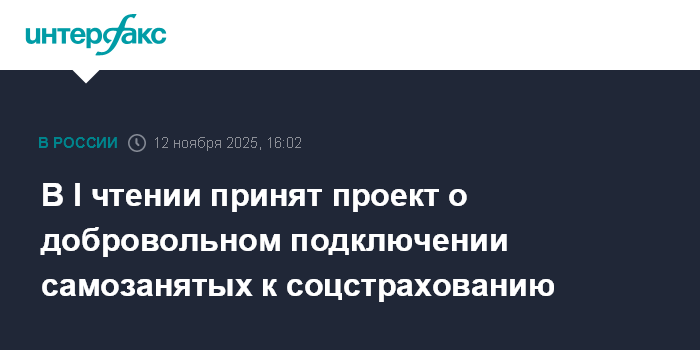 Москва. 12 ноября. INTERFAX.RU - Госдума приняла в первом чтении законопроект о проведении с 1 января 2026 г. по 31 декабря 2028 г. эксперимента, который позволит самозанятым гражданам платить ежемесячно взносы в Социальный фонд РФ, чтобы в случае болезни иметь возможность получать пособие.