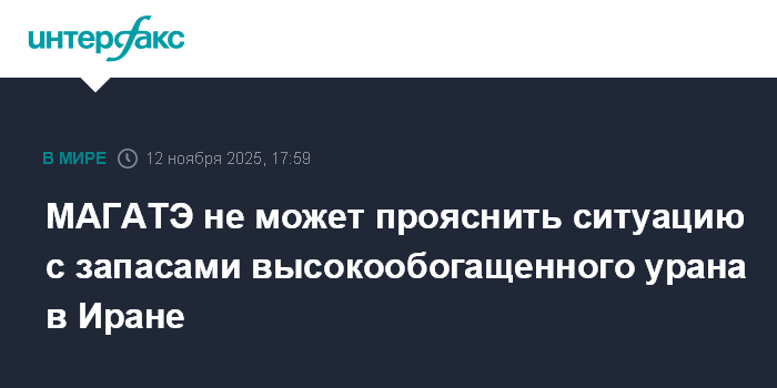 Москва. 12 ноября. INTERFAX.RU - Международное агентство по атомной энергии не знает, что происходит с запасами высокообогащенного урана в Иране после обострения между Ираном и Израилем в июне 2025 года, сообщает AP со ссылкой на секретный отчет МАГАТЭ для стран-участниц агентства.