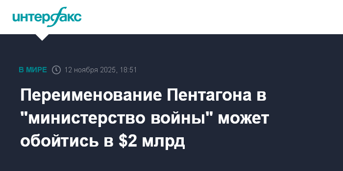 Москва. 12 ноября. INTERFAX.RU - Смена названия Минобороны США на "министерство войны" может стоить американскому федеральному бюджету $2 млрд, сообщает в среду NBC News со ссылкой на источники.