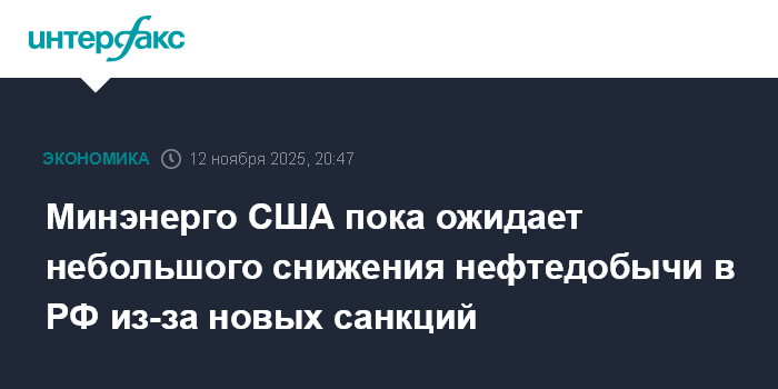 Минэнерго США пока ожидает небольшого снижения нефтедобычи в РФ из-за новых санкций