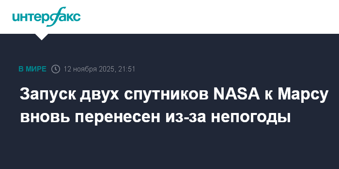 Москва. 12 ноября. INTERFAX.RU - Запуск двух спутников NASA в рамках миссии EscaPADE к Марсу для изучения его магнитосферы, планировавшийся в минувшее воскресенье, а затем в среду, вновь перенесен в связи с неблагоприятными погодными условиями, сообщила компания-разработчик ракеты-носителя New Glenn компании Blue Origin.