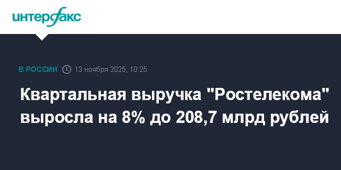 Москва. 13 ноября. INTERFAX.RU - Выручка ПАО "Ростелеком" в III квартале 2025 года составила 208,7 млрд рублей, на 8% больше, чем годом ранее, сообщила компания.