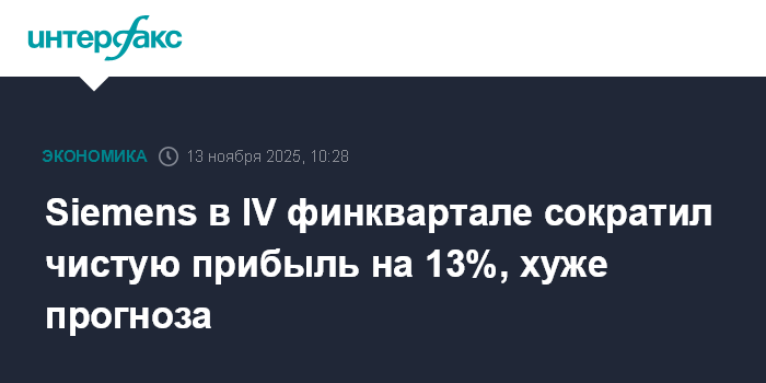 Москва. 13 ноября. INTERFAX.RU - Крупнейший в Европе промышленный конгломерат Siemens AG в четвертом квартале 2025 финансового года сократил чистую прибыль на 13%, что оказалось хуже ожиданий экспертов.