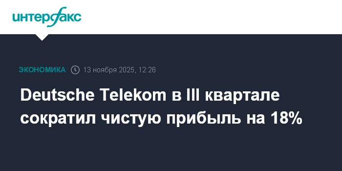 Москва. 13 ноября. INTERFAX.RU - Deutsche Telekom AG, крупнейшая телекоммуникационная компания Европы, в третьем квартале сократила чистую прибыль на 18% - до 2,427 млрд евро с 2,957 млрд евро годом ранее, сказано в отчетности.