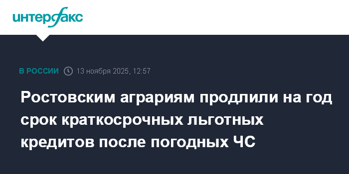 "12 ноября вступило в силу решение Минсельхоза России о пролонгации на год льготных кредитов для донских аграриев, пострадавших от чрезвычайной ситуации в 2025 году", - говорится в сообщении.