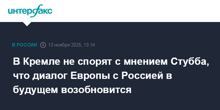Москва. 13 ноября. INTERFAX.RU - В Кремле полагают, что можно согласиться с заявлением президента Финляндии Александра Стубба, что диалог Европы с Россией в будущем будет рано или поздно восстановлен, но не считают, что, исходя из одного заявления, в этом можно усматривать тенденцию.