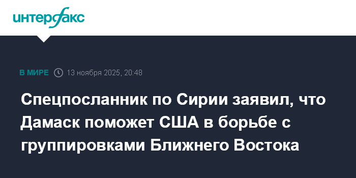 Москва. 13 ноября. INTERFAX.RU - Спецпосланник США по Сирии Томас Баррак заявил, что Сирия наравне с Вашингтоном будет противостоять различным террористическим формированиям на Ближнем Востоке.
