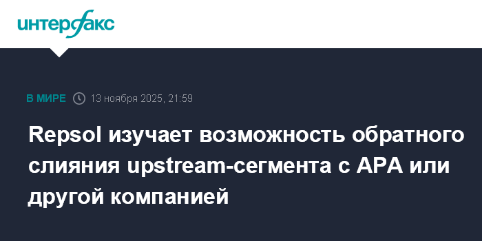 Москва. 13 ноября. INTERFAX.RU - Испанская нефтегазовая Repsol рассматривает возможность обратного слияния своего upstream-сегмента с американской APA Corp. (бывшая Apache Corp.) или другой компанией, пишет Bloomberg со ссылкой на информированные источники.