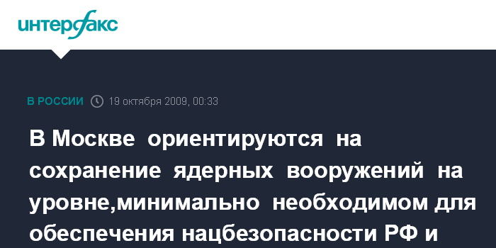 Москва. 19 октября. ИНТЕРФАКС - Россия ориентируется на сохранение ядерных вооружений на уровне, минимально необходимом для обеспечения национальной безопасности страны и ее союзников, заявил президент РФ Дмитрий Медведев.