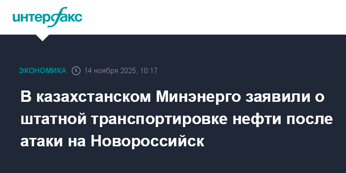 Москва. 14 ноября. INTERFAX.RU - Казахстан продолжает в штатном режиме транспортировку своей нефти по системам, проходящим через порт в Новороссийске, нефтетерминал которого пострадал от фрагментов беспилотников, сообщила официальный представитель министерства энергетики Асель Серикпаева.