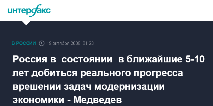 Россия в состоянии в ближайшие 5-10 лет добиться реального прогресса врешении задач модернизации экономики - Медведев