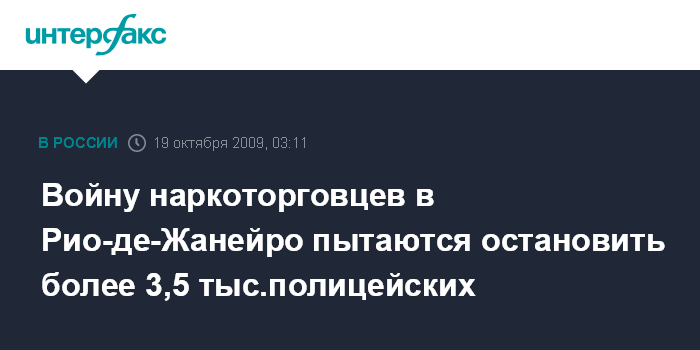 Лондон. 19 октября. ИНТЕРФАКС - Бразильские власти направили дополнительно 3500 полицейских в район на северной окраине Рио-де-Жанейро, где в субботу произошли столкновения конкурирующих группировок наркоторговцев, сообщает Би-би-си.