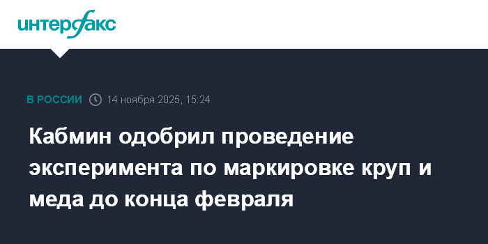 Москва. 14 ноября. INTERFAX.RU - Эксперимент по маркировке в системе "Честный знак" круп, макарон, зерновых продуктов для завтрака, картофеля быстрого приготовления, а также меда стартует в РФ с этой пятницы и продлится до 28 февраля 2026 года. Соответствующее постановление утверждено и распространено правительством РФ.