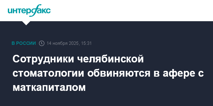 Москва. 14 ноября. INTERFAX.RU - В Челябинске следователь МВД возбудил в отношении десяти человек уголовное дело о хищении средств материнского капитала через фиктивное лечение в зубной клинике, сообщил региональный главк МВД.