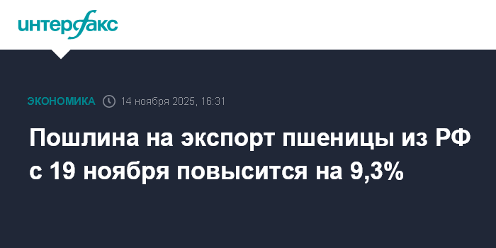 Пошлина на экспорт пшеницы из РФ с 19 ноября повысится на 9,3%