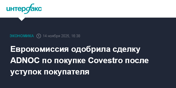 Москва. 14 ноября. INTERFAX.RU - Еврокомиссия одобрила сделку Abu Dhabi National Oil Co. (ADNOC) по покупке германской химической компании Covestro AG.