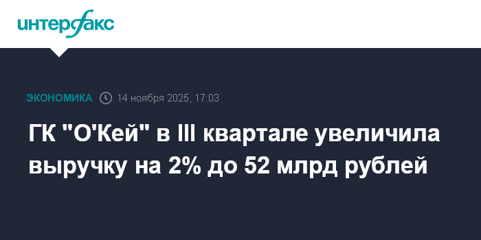 Москва. 14 ноября. INTERFAX.RU - Ритейлер ГК "О`Кей" (O`Key Group) в III квартале 2025 года увеличил чистую розничную выручку на 2% до 52 млрд рублей, сообщила компания.