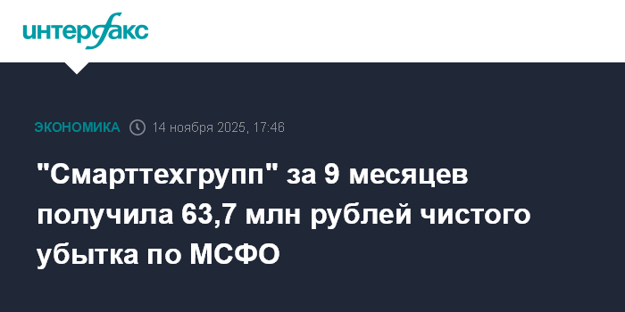 Москва. 14 ноября. INTERFAX.RU - ПАО "Смарттехгрупп" (СТГ), основным активом которого является микрофинансовая компания МФК "ПСБ Финанс" (ранее МФК "КарМани"), за девять месяцев 2025 года получило 63,66 млн рублей чистого убытка по МСФО против прибыли в 321 млн рублей годом ранее, говорится в отчетности СТГ.