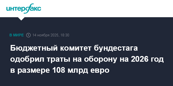Москва. 14 ноября. INTERFAX.RU - Комитет по бюджету парламента ФРГ в пятницу одобрил проект оборонных трат в 108,2 млрд евро на 2026 год, говорится в пресс-релизе Минобороны Германии.