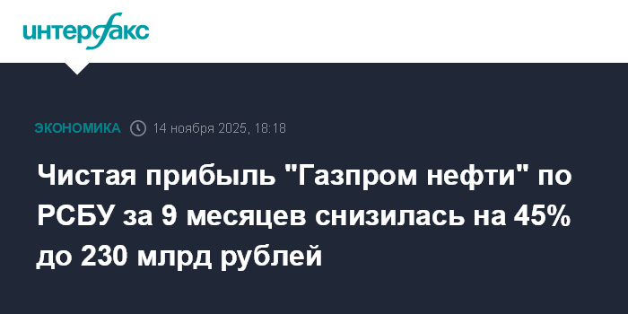 Москва. 14 ноября. INTERFAX.RU - Чистая прибыль "Газпром нефти" по РСБУ за 9 месяцев 2025 года составила 230 млрд рублей, что на 45% меньше аналогичного периода 2024 года (420 млрд рублей), говорится в отчете компании.