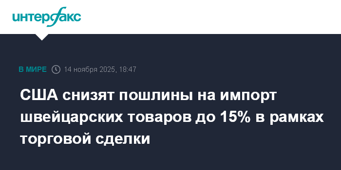 Москва. 14 ноября. INTERFAX.RU - США и Швейцария фактически согласовали торговую сделку, в рамках которой пошлины на швейцарские товары будут снижены до 15% с 39%, заявил торговый представитель США Джеймисон Грир.