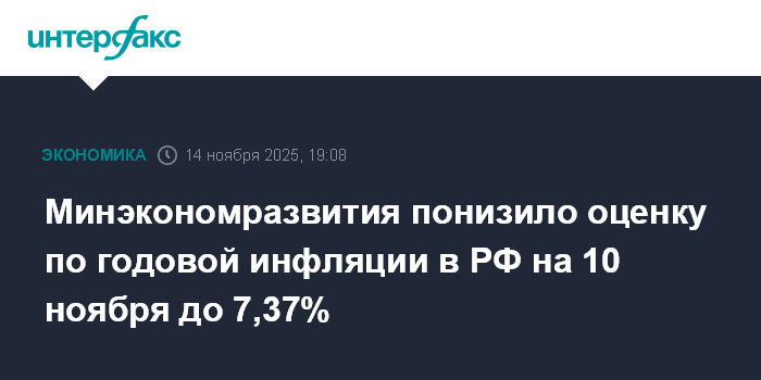 Москва. 14 ноября. INTERFAX.RU - Минэкономразвития понизило свою оценку по годовой инфляции в РФ на 10 ноября до 7,37% с 7,73% после выхода данных Росстата по инфляции в октябре, которые оказались значительно ниже ожиданий и недельных оценок, говорится в картине инфляции министерства "О текущей ценовой ситуации".
