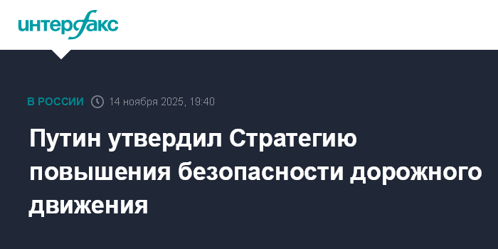 Москва. 14 ноября. INTERFAX.RU - Президент РФ Владимир Путин утвердил Стратегию повышения безопасности дорожного движения в России на период до 2030 года и на перспективу до 2036 года.