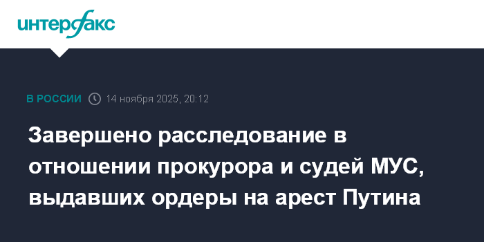Москва. 14 ноября. INTERFAX.RU - Следственный комитет РФ (СКР) завершил расследование уголовного дела в отношении прокурора и восьми судей Международного уголовного суда (МУС), выдавших ордеры на арест президента России Владимира Путина и детского омбудсмена Марии Львовой-Беловой в связи с событиями на Украине, сообщили в ведомстве.