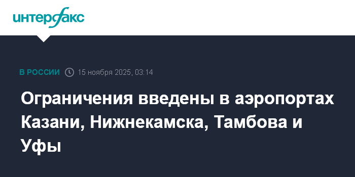 Москва. 15 ноября. INTERFAX.RU - Аэропорты Казани, Нижнекамска, Тамбова и Уфы приостановили работу, сообщили в Росавиации.