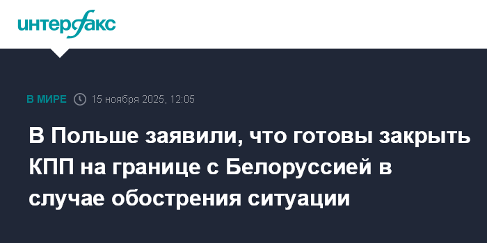 Москва. 15 ноября. INTERFAX.RU - Польша в случае обострения ситуации на границе с Белоруссией повторно закроет два пункта пропуска, которые возобновляют работу с 17 ноября, заявили в польском МВД.