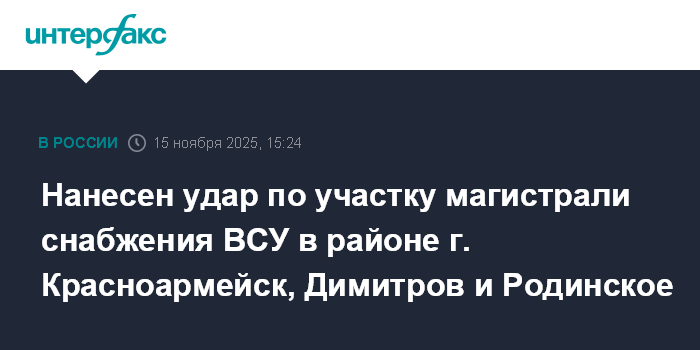 Москва. 15 ноября. INTERFAX.RU - Российские военные нанесли удар по участку одной из магистралей снабжения группировки ВСУ в треугольнике городов Красноармейск-Димитров-Родинское, сообщило Минобороны РФ в субботу.