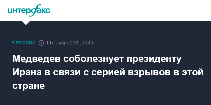 Москва. 19 октября. INTERFAX.RU - Президент России Дмитрий Медведев выразил соболезнования президенту Исламской Республики Иран Махмуду Ахмадинежаду в связи с серией терактов, сообщает в понедельник пресс-служба президента РФ.
