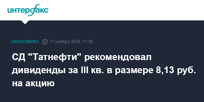 Москва. 17 ноября. INTERFAX.RU - Совет директоров "Татнефти" на заочном заседании, прошедшем 12 ноября, рекомендовал акционерам утвердить дивиденды за третий квартал 2025 года в размере 8,13 рубля на акцию, говорится в сообщении компании.
