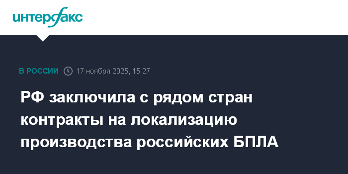 Москва. 17 ноября. INTERFAX.RU - Глава "Рособоронэкспорта" Александр Михеев сообщил, что РФ заключила с рядом стран контракты на локализацию производства российских беспилотников.