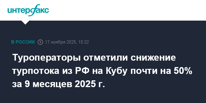 "По статистике Погранслужбы РФ, российский турпоток на Кубу с января по сентябрь 2025 года сократился на 41%. Динамика продаж туроператоров соответствует данным статистики: объемы продаж по Кубе отстают от показателей прошлого года почти на 50% - в том числе и потому, что рейсов на "остров Свободы" стало значительно меньше из-за сильной конкуренции за самолеты с Юго-Восточной Азией. Да, к сервису остаются вопросы, но направление остается любимым у россиян: на острове безопасно, душевно и всегда рады нашим туристам, уважают русскую культуру", - цитирует его пресс-служба Российского союза туриндустрии.