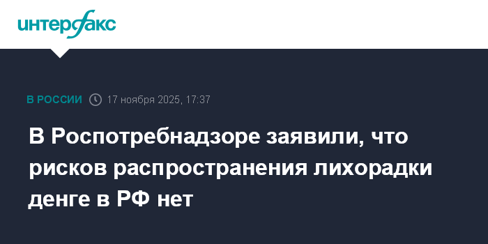 Москва. 17 ноября. INTERFAX.RU - Роспотребнадзор заявил, что внимательно отслеживает информацию о вспышке лихорадки денге в Нигерии, однако угрозы распространения заболевания в России нет.