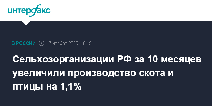 Москва. 17 ноября. INTERFAX.RU - Производство скота и птицы в сельхозорганизациях РФ за 10 месяцев этого года составило 11,5 млн тонн (в живом весе, на убой), что на 1,1% больше, чем годом ранее, сообщает Росстат.