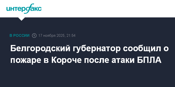 Москва. 17 ноября. INTERFAX.RU - В Белгородской области в городе Короча загорелся коммерческий объект после атаки БПЛА, сообщил губернатор Вячеслав Гладков. По предварительной информации, пострадавших нет.