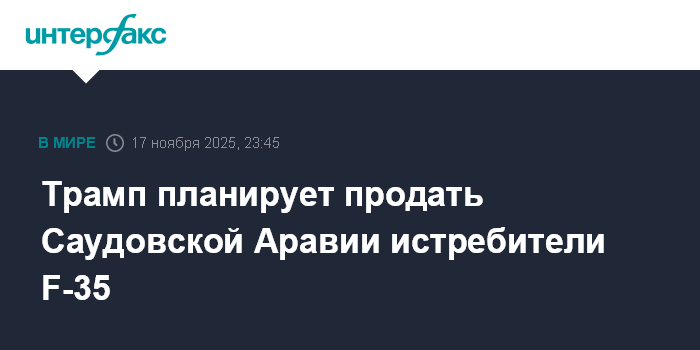 Москва. 17 ноября. INTERFAX.RU - Президент США Дональд Трамп заявил, что Саудовская Аравия хочет купить у США истребители F-35, и он намерен продать их Эр-Рияду.