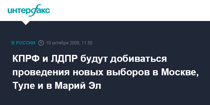 Москва. 19 октября. INTERFAX.RU - КПРФ и ЛДПР потребуют отмены результатов парламентских выборов в Москве, Туле и республике Марий Эл, прошедших 11 октября, и проведения повторных выборов в марте 2010 года.