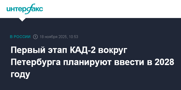 Москва. 18 ноября. INTERFAX.RU - Первый этап второй кольцевой автодороги (КАД-2) вокруг Петербурга планируется ввести в 2028 году, говорится в материалах госкомпании "Автодор" к "Транспортной неделе - 2025".