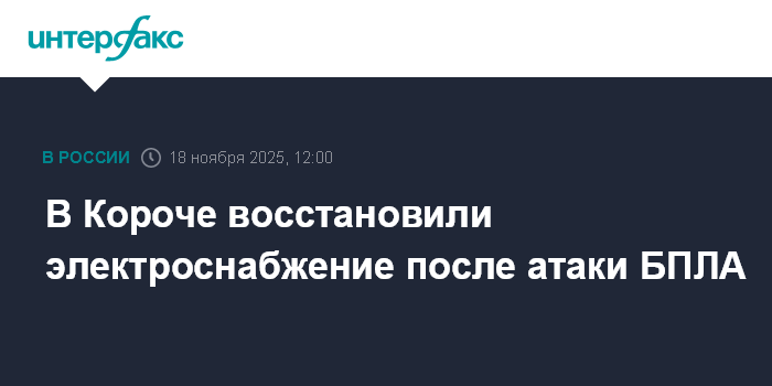 Москва. 18 ноября. INTERFAX.RU - В Белгородской области восстановили электроснабжение города Корочи и сел Погореловка и Подкопаевка после атаки БПЛА, сообщил губернатор региона Вячеслав Гладков.