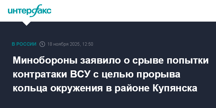 Москва. 18 ноября. INTERFAX.RU - Российские военные ведут уничтожение окруженных украинских подразделений в Купянске, за минувшие сутки сорвана попытка контратаки ВСУ с целью прорыва кольца окружения, сообщили в Минобороны РФ во вторник.