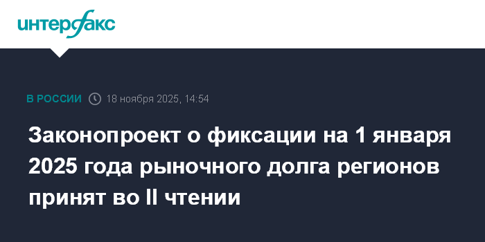 Москва. 18 ноября. INTERFAX.RU - Госдума приняла во втором чтении законопроект, который устанавливает, что с 2026 года для получения бюджетных кредитов регионами уровень рыночного долга должен быть зафиксирован в размере не более 25% от доходов на 1 января 2025 года.