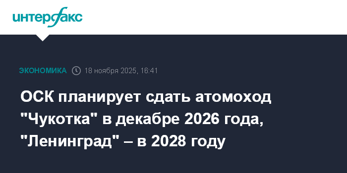 ОСК планирует сдать атомоход "Чукотка" в декабре 2026 года, "Ленинград" – в 2028 году