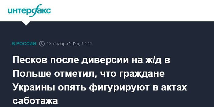 Москва. 18 ноября. INTERFAX.RU - Пресс-секретарь президента РФ Дмитрий Песков, комментируя взрыв на железной дороге в Польше, ведущей на Украину, отметил, что примечателен тот факт, что опять фигурируют граждане Украины в актах саботажа в отношении объектов критической инфраструктуры.