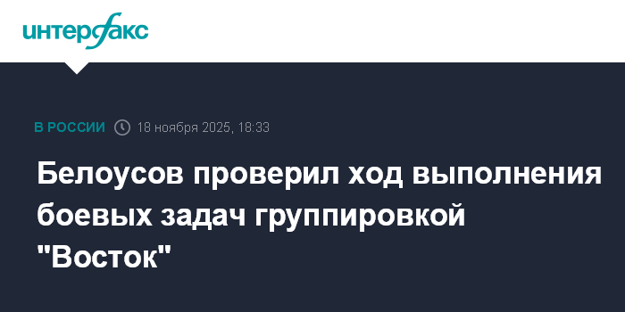 Москва. 18 ноября. INTERFAX.RU - Министр обороны РФ Андрей Белоусов проверил ход выполнения боевых задач соединениями и воинскими частями группировки войск "Восток" в зоне проведения СВО, сообщило военное ведомство.