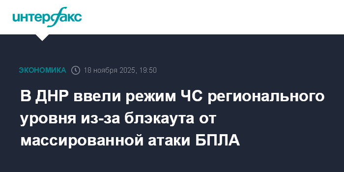 Москва. 18 ноября. INTERFAX.RU - Режим ЧС регионального уровня введен в Донецкой Народной Республике из-за масштабного блэкаута в результате атаки на местные электростанции, соответствующий указ подписал глава региона Денис Пушилин.