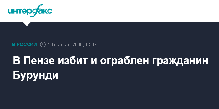 Москва. 19 октября. INTERFAX.RU - Правоохранительные органы Пензенской области расследуют обстоятельства нападения на гражданина африканского государства Бурунди в областном центре. "Нападение было совершено неизвестными в воскресенье вечером в Первомайском районе Пензы", - сообщили в понедельник агентству "Интерфакс-Поволжье" в пресс-службе регионального УВД. Злоумышленники причинили африканцу телесные повреждения и похитили паспорт, сказал собеседник агентства. Примет нападавших заявитель не помнит, так как находился в алкогольном опьянении, отметил представитель пресс-службы.